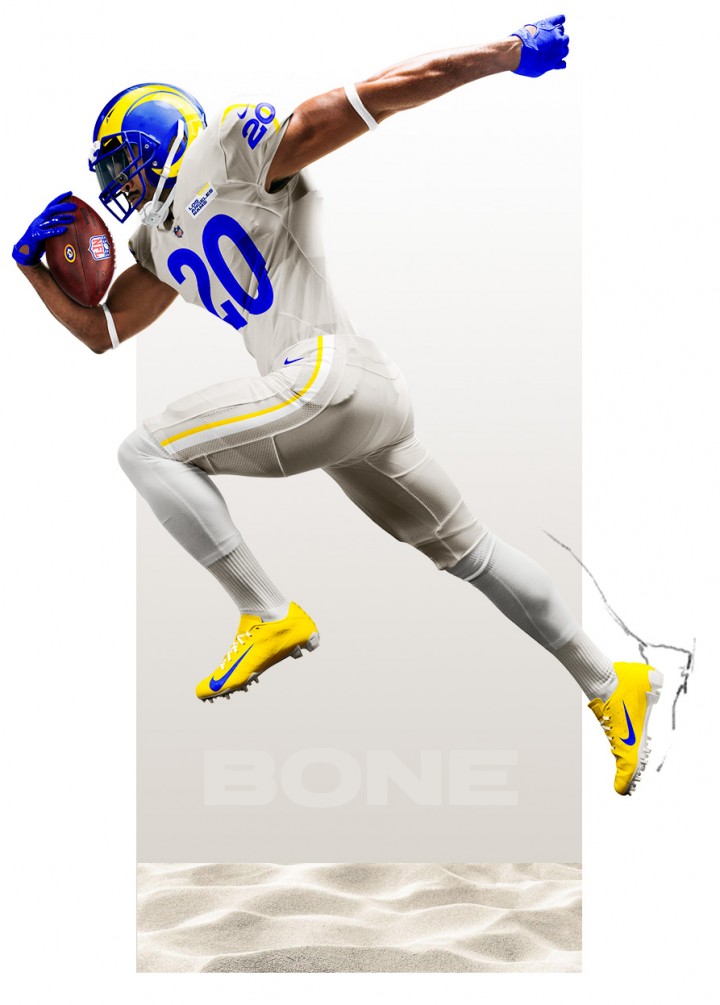 Die LA-Marke wurde mit dem Fokus auf das Horn, das mit LA verflochten ist, entworfen, um sicherzustellen, dass die Rams für immer mit der Stadt Los Angeles verbunden sind. Der Farbverlauf des Horns geht von einem weißen Horn zu einem leuchtenderen "Sol"-Horn über, als Hommage an die Entwicklung der Farbe der Hörner, die in der Vergangenheit die Helme der Rams geschmückt haben.