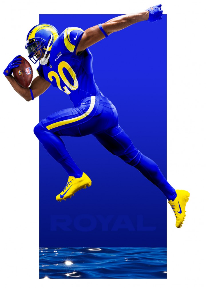 Das Zeichen wurde so gestaltet, dass es ein Gefühl von Aufwärts- und Vorwärtsbewegung hervorruft, das durch die Farbverläufe noch verstärkt wird. Die Buchstaben sind kursiv gesetzt und spiegeln den verbundenen, fortschrittlichen Charakter sowohl von LA als auch der Rams-Organisation wider. Die Tiefe des Markendesigns schafft einen anspruchsvollen Look, der für die Rams innerhalb des Ökosystems der NFL einzigartig ist.
