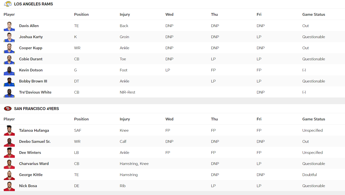 Der in meinen Augen kleine Lichtblick ist der Ausfall von RB McCaffrey, WR Samuel Sr. sowie der vermeintliche Ausfall von TE Kittle.
