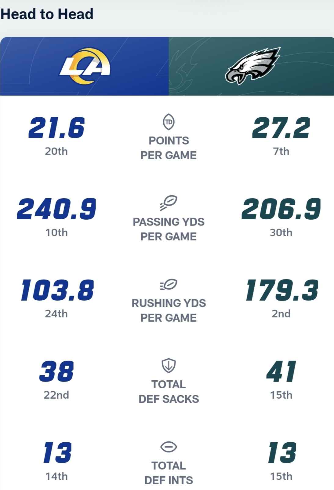 Mit 278,4 zugelassenen Yards/Game, davon 174,2 durch die Luft, sowie nur 17,8 Punkte pro Spiel ist die Defense die beste der Liga. Einzig gegen den Lauf lässt die Philly-Defense ein klein wenig Federn, wobei man beim 10. Platz innerhalb der Liga auch nicht gerade von einer großen Schwäche reden sollte. Es gibt also wenig auszusetzen an der Verteidigung und angeführt von Edge Montez Sweat und DT Jalen Carter wird der Pass Rush die Rams-Offense vor einige Probleme stellen. In der Regular Season konnten wir wenig Mittel gegen sie finden.
