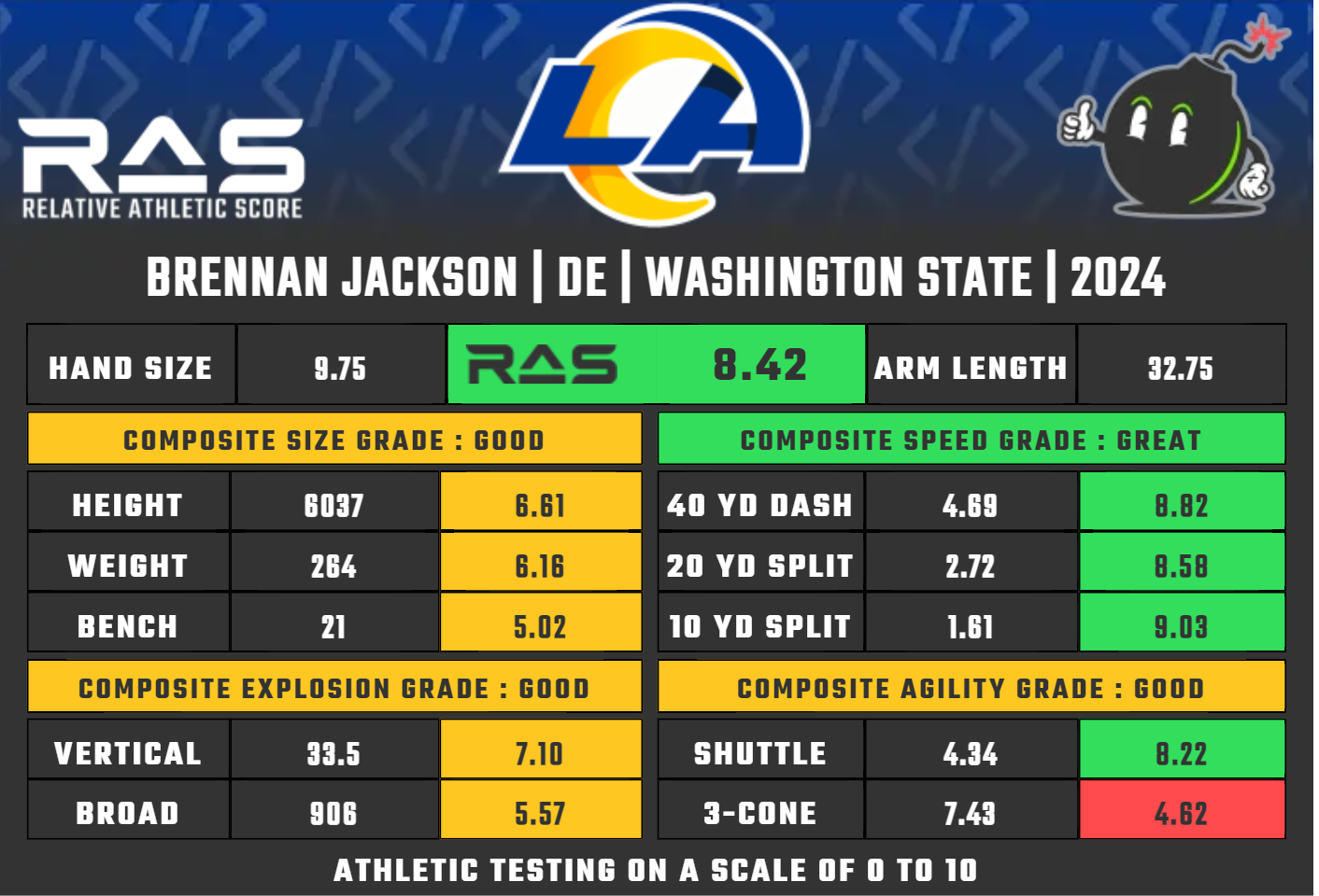 Der erste Pick an dritten Draft Tag erfolgte in Runde fünf, damit wurde EDGE Brennan Jackson ausgewählt. In fast allen Scouting, Berichten und Draftboards wird er als EDGE gelistet, die Rams gaben ihn bei der Bekanntgabe als Linebacker an. Ob er als Linebacker bei den Rams spielen wird, wird sich zeigen. Aufgewachsen ist Brennan in Südkalifornien und begann im Alter von sieben Jahren Football zu spielen.