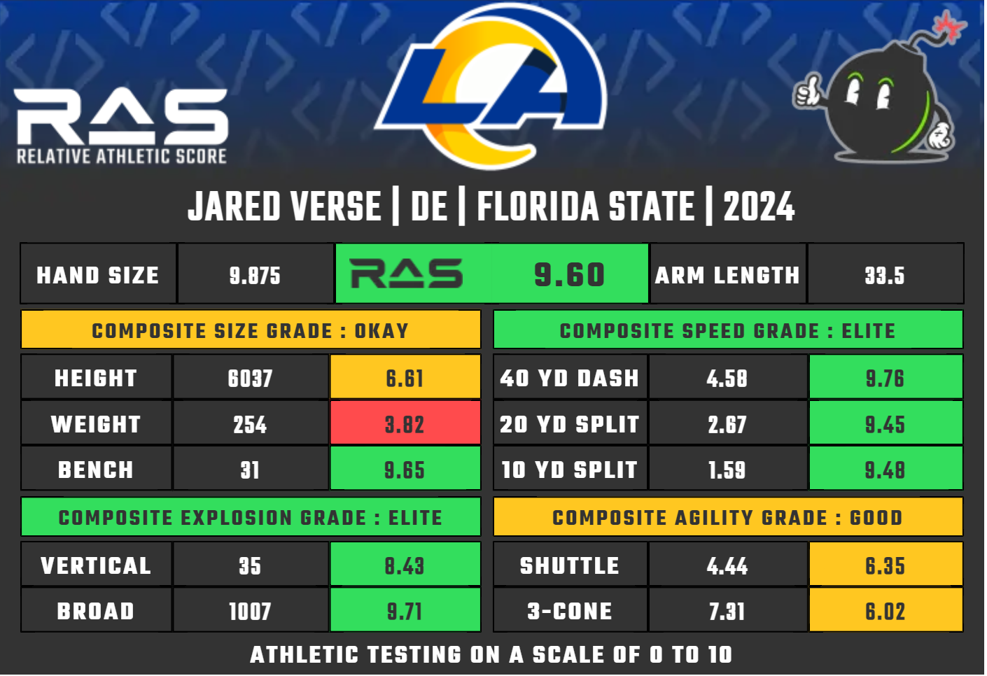 Mit ihrem ersten First Round Pick seit Jared Goff, welcher 2016 von den Rams ausgewählt wurde, haben sich die Rams erneut für einen Jared entschieden. Dieses Mal aber für einen Edge Rusher. Jared Verse von Florida State wurde an 19. Stelle von den Rams ausgewählt. Seine Footballkarriere begann er als Tight End, ehe er am College zum Edge umschulte, weil er dort einen besseren und langfristigeren Weg für seine Footballkarriere sah. Seine Leistungen beim Division I College Albany sprachen sich schnell herum und kam es nicht überraschend, dass namhafte Colleges wie Florida State, LSU, Oklahoma und weitere auf ihn aufmerksam wurden. Verse entschied sich für Florida State. In seinen zwei Jahren für Florida State hatte Verse 29 Tackles for Loss und 18 Sacks in 25 Spielen. Während andere Spieler (Turner) die Covid-Pandemie als Ausrede für Übergewicht nutzten, baute er sich mit seinem Dad ein Home-Gym und legte 40 Pfund an Muskeln zu. Das zeigt sich auch im Spiel: Jared Verse ist ein Power-Rusher allererster Klasse.